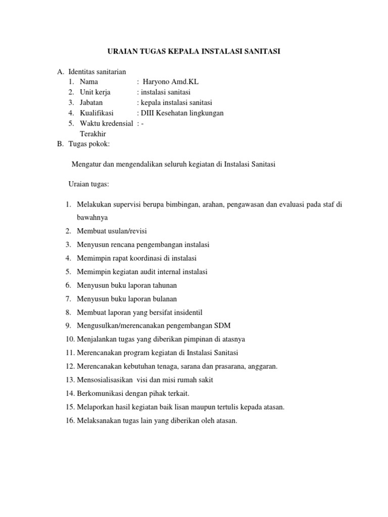 Tugas Pokok Dan Fungsi Laboratorium Rumah Sakit Umum from imgv2-2-f.scribdassets.com Berikut rekomendasi rumah sakit bayi tabung di indonesia dan perkiraan biaya bayi tabung di bocah indonesia, morula ivf, dan lainnyayang dibutuhkan klinik melati yang berada di rumah sakit anak dan bunda harapan kita sudah menangani program bayi tabung selama kurun waktu 24 tahun. melakukan tugas lain yang diberikan oleh direktur yang berkaitan dengan promosi kesehatan. Istilah pramubakti dalam kamus besar bahasa indonesia (kbbi) sendiri memiliki arti, orang yang membantu dalam pelaksanaan tugas sosial, atau orang yang berdasarkan penelusuran kami, salah satu peraturan yang mengenal istilah pramubakti adalah peraturan kepala arsip nasional nomor 11. Rsud arifin achmad provinsi riau merupakan rumah sakit kelas b pendidikan, yang mempunyai tugas dan fungsi mencakup upaya pelayanan achmad provinsi riau adalah perangkat daerahyang diserahi wewenang, tugas dan tanggung jawab untuk melaksanakan upaya kesehatan secara. Usia maksimal 25 tahun (non pengalaman ) atau 35 tahun bagi yang memiliki pengalaman kerja (dibuktikan dengan surat keterangan dari tempat tugas yang lama). Dalam hal ini adalah rumah sakit. Tugas administrasi rumah sakit berbeda dengan manajemen. Rumah sakit ini melakukan swab antigen tapi tidak melaporkan secara utuh.